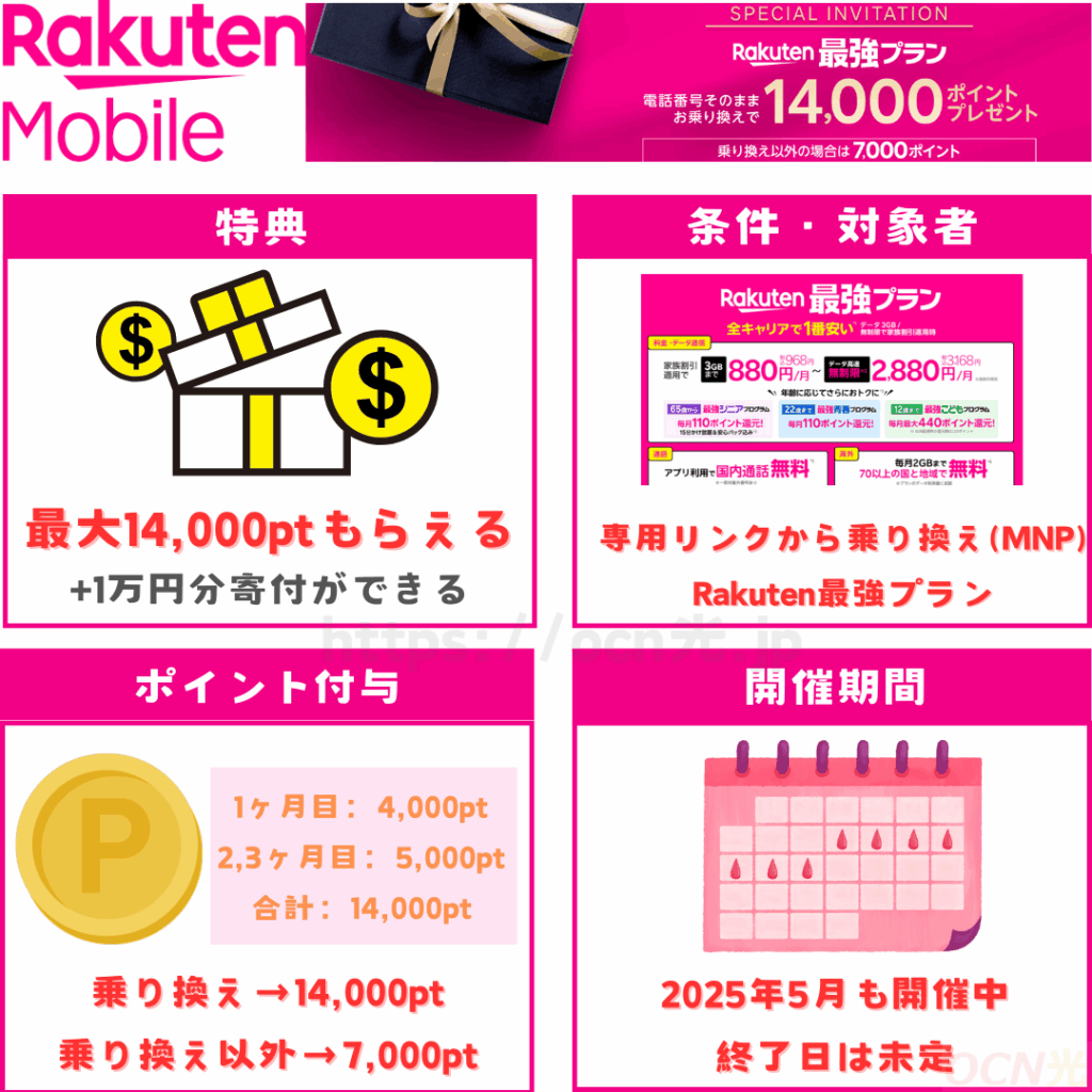 楽天モバイルの三木谷キャンペーンは、専用ページからの申込みで最大14,000ポイントがもらえるお得なキャンペーンです。